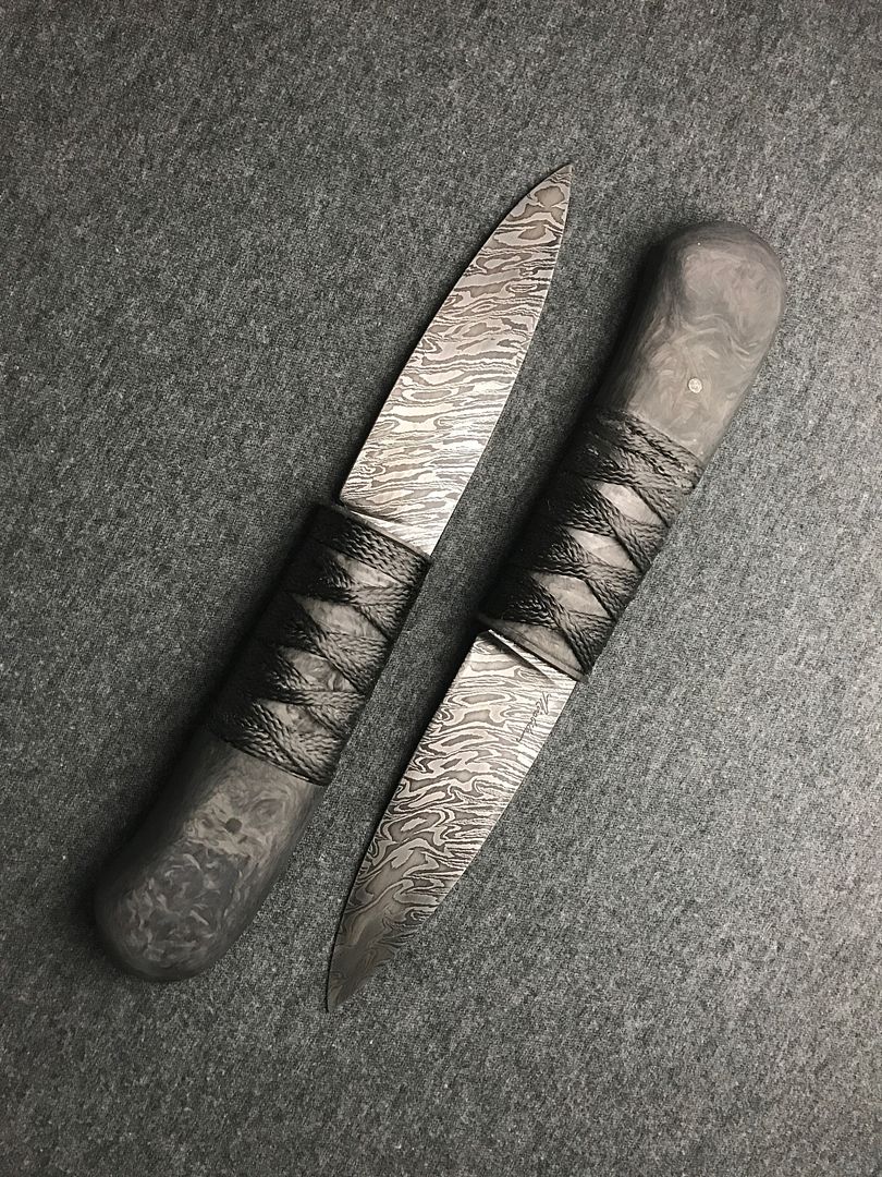 I decided on commissioning a matched (as matched as can be in a hand Forged Damascus piece) set of aggressive styled hunters from my dear friend a David Mirabile