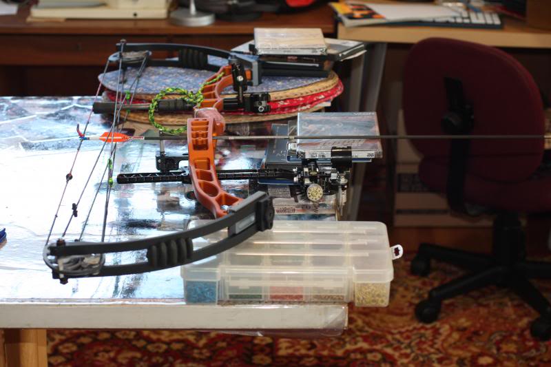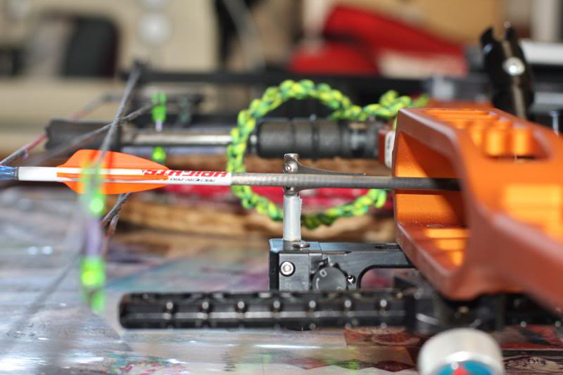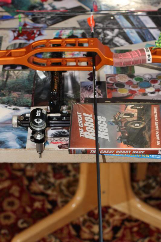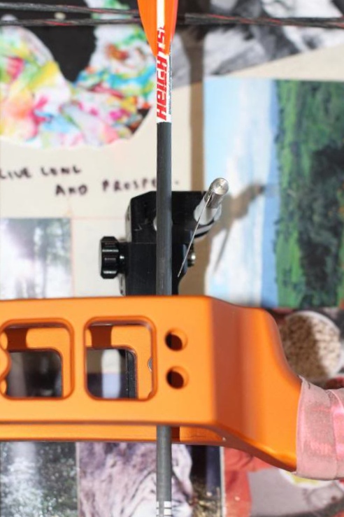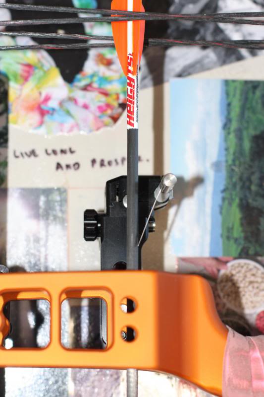 Weight of the arrow causes the blade to SAG. This is a GOOD thing. WHY? Cuz, the blade is a leaf spring suspension. The blade only GUIDES the arrow, during arrow launch. The arrow accelerates SOOOOO fast, the nock starts moving forwards BEFORE the point of the arrow starts moving forwards. This compresses the arrow tube and the arrow bends up and down and up and down, during the arrow launch. So, the blade LEAF SPRING suspension is designed to work as a SHOCK absorber....to calm down the bending of the arrow tube. WE can INCREASE the leaf spring suspension stiffness by moving the blade in the UP direction, several THOUSANDTHS of an inch. Paper for the computer printer is 0.003-inches thick. WE can DECREASE the leaf spring suspension by moving the blade in the DOWN direction. How do I know if I need MORE stiffness or LESS stiffness?