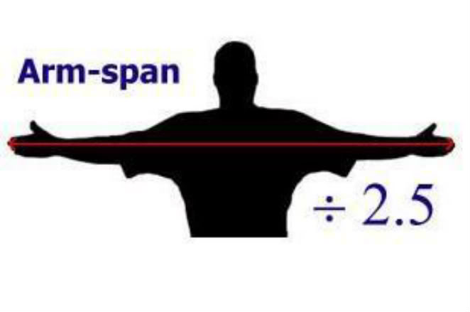 We take this horizontal measurement, and divide by 2.5, to get a reasonable estimate of your draw length. This formula is not ideal, but gives an idea of your RECURVE draw length.